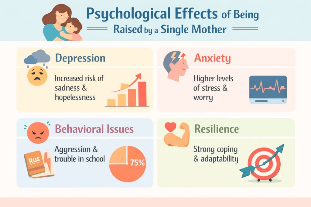 The psychological effects of being raised by a single mother vary widely. Some children develop independence early. Others struggle with internalizing symptoms such as sadness or worry.